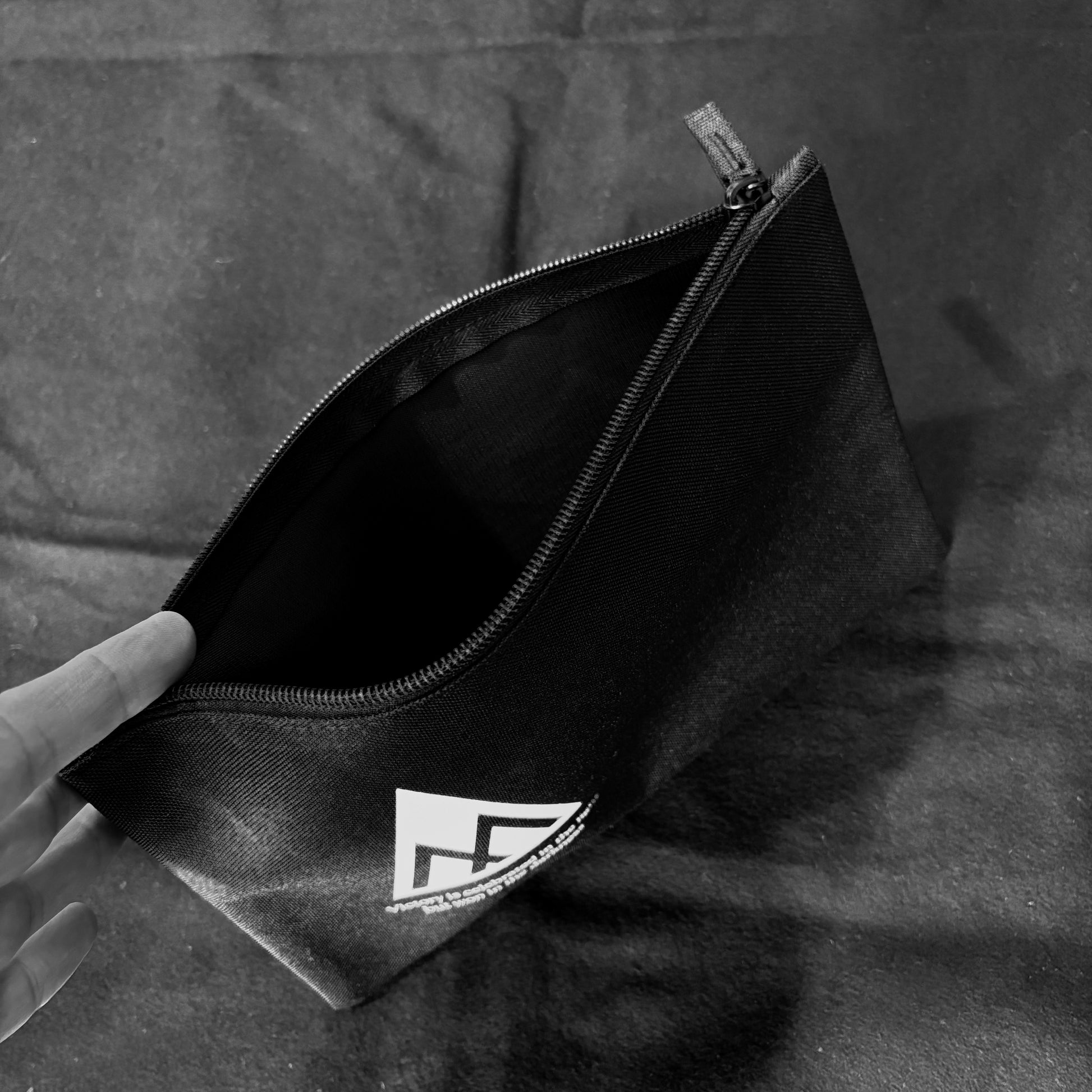 A flat black case for all of your favorite gadgets and items. It has a zipper that runs along the long edge. The front has the M logo and "Victory is celebrated in the light but won in the darkness" printed on it. The back has no graphics.